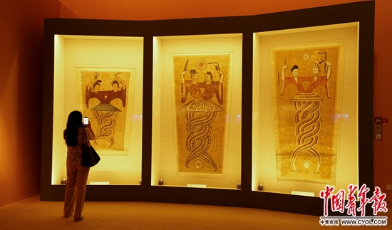 中国国家博物馆与新疆维吾尔自治区博物馆共同举办的“万里同风——新疆文物精品展”,7月9日起在国博展出两个月。本次展览共展出191件(套)新疆各地出土的精美文物,包括曾在《国家宝藏》第二季中亮相的“绢衣彩绘木俑”“彩绘伏羲女娲绢画”。图右绢画即为“彩绘伏羲女娲绢画”,1966年吐鲁番阿斯塔那42号墓出土。二人上身相拥,下尾相交,上方有太阳,尾下是月亮,两边是星辰。实习生 郭琍晶/摄