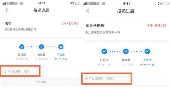 让她感到意外的是,7月4日,她收到了前一天简历投递的结果。投递进展显示,简历“被查看”后,一分钟之内浙江喜来登度假村有限公司便给出两个“不合适”的通知。不合适原因后面,写着三个灰色小字:河南人。