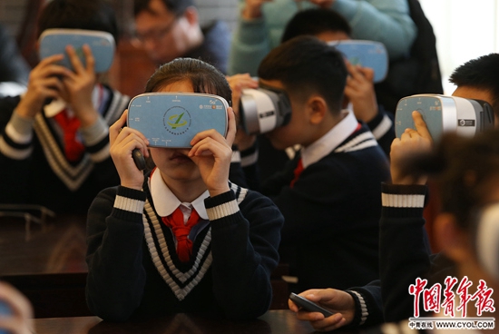 11月26日,北京市朝阳区实验小学,学生们戴上VR眼镜,通过5G信号在全景视频中“游历”,进行沉浸式学习。日前,北京市首个5G网络下VR教学服务项目在该校幸福校区投入使用。据介绍,该项目组结合国家课程标准及学科目标,已经基本建成了5G+VR应用资源库,让教师在教学过程中,可以便捷地运用虚拟现实技术服务教学,让学生在课堂中便可体验多种类、多形式的学习场景。中国青年报·中国青年网记者 陈剑/摄