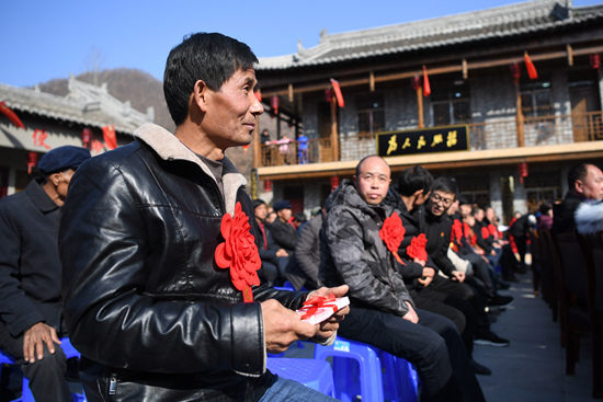 1月7日,村民康耀林(前)在分红大会上领到分红。