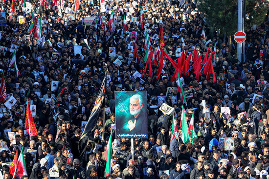 1月7日,在伊朗克尔曼市,人们参加苏莱曼尼的葬礼。据伊朗电视台7日报道,当天在伊朗克尔曼市为伊朗伊斯兰革命卫队下属“圣城旅”指挥官卡西姆·苏莱曼尼举行的葬礼上发生踩踏事件,造成至少35人死亡、48人受伤。新华社/法新