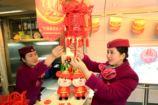 1月7日,重庆西至上海虹桥的G1339次列车上,乘务员们正在挂灯笼、贴福字。全国春运到来前夕,当地铁路运输部门在列车上通过各种形式营造节日氛围。包亮/摄