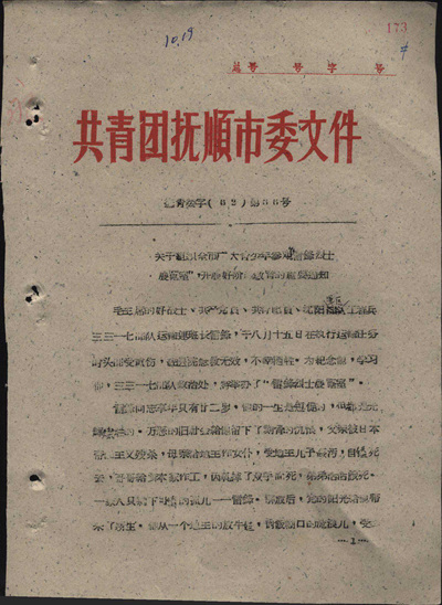 团抚顺市委的资料显示,这是全国第一份号召学习雷锋的地方性文件,由此,团抚顺市委开创了地方学雷锋的先河。以文件印发为标志,抚顺群众性学雷锋活动迅速开展起来,在抚顺市委直接领导下,团抚顺市委组织广大青少年进行了有组织、有计划、有步骤、有目标的学习活动。