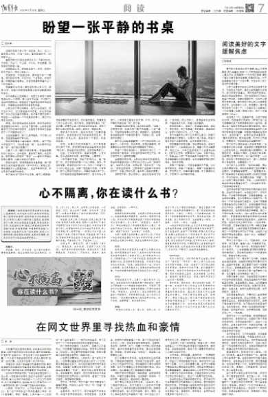 编者按:“培养阅读的习惯能够为你筑造一座避难所,让你逃脱几乎人世间的所有悲哀。”疫情阴云密布,宅家的我们不如捧起书本,以书疗心。每个人都不是一座孤岛,疫情隔离了人群,却无法隔绝爱与善意。隔离在家的日子,你在读什么书?遇见了哪些难忘的书中灵魂?日前,中国青年报·中国青年网发起“心不隔离,你在读什么书?”征文活动,这样一个特殊时期,虽没有华灯满街,没有欢乐喧嚣,但我们仍然可以把生活过得有意义。