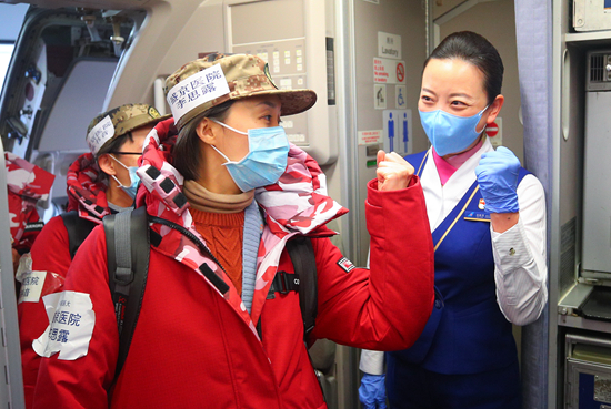 2月17日,医疗队员在登机时与机组人员互相鼓励。