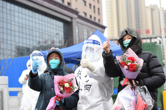 在医院的“心灵寄语墙”上,即将出院的黄大爷留下一张卡片:“因为有你们,走过了疫情的冬天;因为有你们,走进了一个温暖的春天。”