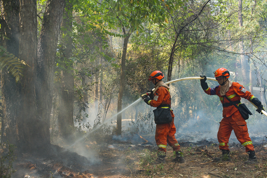 4月1日中午,四川阿坝州森林消防支队的队员正在扑灭西昌泸山卧云山起火点上的余火。3月30日,四川西昌市经久乡发生森林火灾,31日白天明火被扑灭,晚间山火复燃。汪龙华/摄