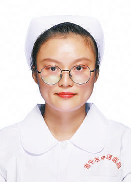 女,汉族,1988年4月出生,群众,广西壮族自治区南宁市中医医院重症医学科护师。2018年1月,南宁市609路公交车上一名老人突然晕倒,在这紧要时刻,她跪地给老人做心肺复苏,为后续抢救赢得了宝贵时间,最终成功挽救了老人的生命。她热心公益,为了让更多群众掌握急救技能,带头成立培训队,坚持利用周末为社区居民义务普及急救知识。