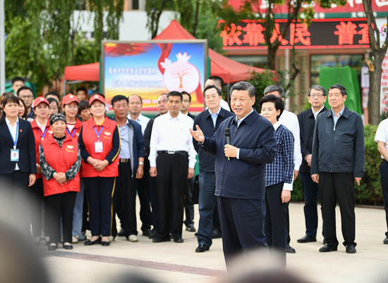 傍晚时分,习近平前往吴忠市利通区金花园社区。社区常住居民13850人,汉、回、满、蒙、藏等各族群众和睦相处,曾荣获“全国民族团结进步模范集体”称号。习近平来到社区党群活动服务中心,了解社区党建工作、民族团结社区创建和为民服务工作情况,同社区志愿者代表亲切交谈。社区广场十分热闹,正在休闲娱乐的居民看见总书记来了,围拢过来,热烈鼓掌。习近平深情对大家说,中华民族是多元一体的伟大民族。全面建成小康社会,一个少数民族也不能少。各民族团结携手,共同迈进全面小康,体现了中华民族优良传统,体现了中国特色社会主义制度的显著优势。社会主义是干出来的,幸福是奋斗出来的。有党和政府持续努力,有各族群众不懈奋斗,今后的生活一定会更好更幸福。