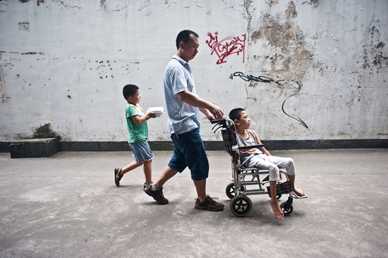 随后的10余年间,吴大宝的生活却遭遇多重变故。大儿子出生时因窒息造成大脑缺氧,左脑脑细胞萎缩,不会说话、无法行走、右半身偏瘫。早点铺经营所得几乎全花在儿子的治疗上。后来随着广州城市扩容带来大面积的旧城、旧村改造,吴大宝的早点铺档口生意大受影响,多年攒下的积蓄基本耗尽,只剩下一辆面包车。从巅峰跌入谷底,吴大宝只好又做回曾经的流动商贩。为了节省房租,他带着妻儿在广州郊区租房。白天到沙河服装市场进货,夜晚开着面包车到天河南街市摆摊。对他来说,经历命运的沉浮,摆摊依旧是一家人的生计,是儿子的希望。