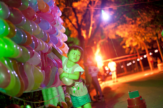 41岁的冯原在员村二横路的临江广场摆气球摊。他5岁的女儿茵茵在河南老家上幼儿园,每逢暑假,妻子会带着女儿来广州短暂相聚。年轻时,冯原就到广州一家做摩托车配件的工厂里打工,后来工厂经营不景气倒闭,冯原便与同在广州打拼的老乡一起打零工,装修、盖楼、搬运工等都做过。白天有活儿干的时候,他能挣大概200元,夜晚就在江边广场摆摊。他想攒多点钱,留给女儿将来念书。