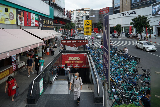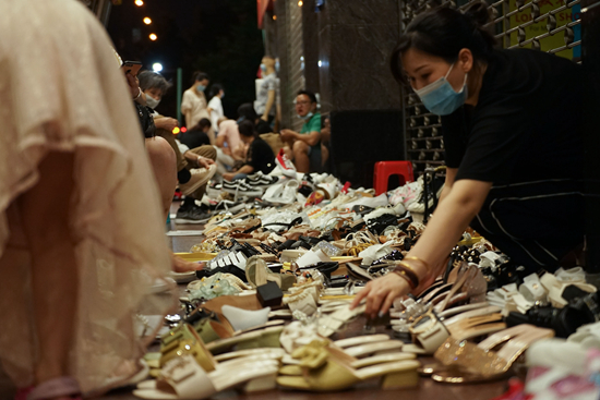 6月4日傍晚,广州火车站西侧的华丽宫鞋城关门后,商户们在商场管理处的组织下在鞋城外摆起地摊。华丽宫主营外贸鞋,受疫情冲击较大,对这里的个体经营者来说,摆地摊多少能减轻经营压力,也是新的机会。