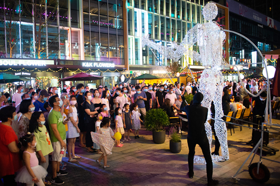 8月8日晚,市民在望京小街商业街观看巨型人偶表演。当日,作为北京消费季活动的一部分,北京市朝阳区的“潮朝阳”消费季活动正式重启,位于朝阳区的新兴商业街望京小街举办开街嘉年华活动。新华社记者 陈钟昊/摄