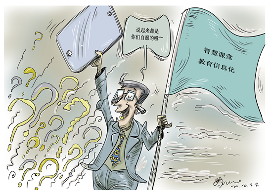 近日,一些学生家长反映学校向家长推荐平板电脑,以“上课要用”“布置作业”等理由变相强制学生购买。记者随国务院督查组调查发现,嘉兴市实验初级中学提供的一整套系统总费用共计6500元。督查组认为,当地教育行政部门打着教学信息化名头,简单认定“学校未强制家长购买平板”,导致有关问题未能及时解决。(“央视焦点访谈”微信公号10月21日)漫画:徐简