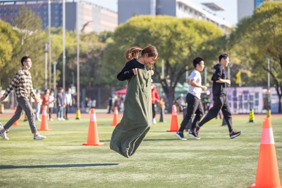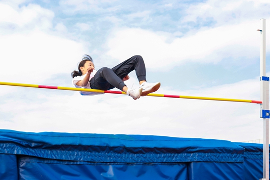 南京邮电大学运动会上,跳高运动员越过横杆。