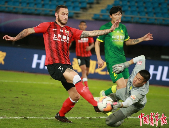11月11日,在苏州市体育中心举行的2020中超联赛季军争夺战第二回合的比赛中,国安队守门员化解一次门前险情。最终,北京国安队以两回合总比分3∶2战胜上海上港队,夺得2020中超联赛的季军,同时获得参加下赛季亚洲冠军联赛的资格。中青报·中青网记者 刘占坤/摄