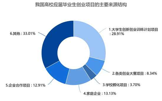 在已有创业项目的毕业生中,其创业项目的主要来源结构为:其他(33.01%)、大学生创新创业训练计划项目(28.91%)、家庭企业(13.13%)、企业合作项目(12.91%)、各类创业大赛项目(8.34%)、学校孵化项目(3.70%)。课题组进一步对选择“其他”项的毕业生展开追踪访谈,发现“其他”主要集中于“网络宣传项目”“朋友合伙项目”等。