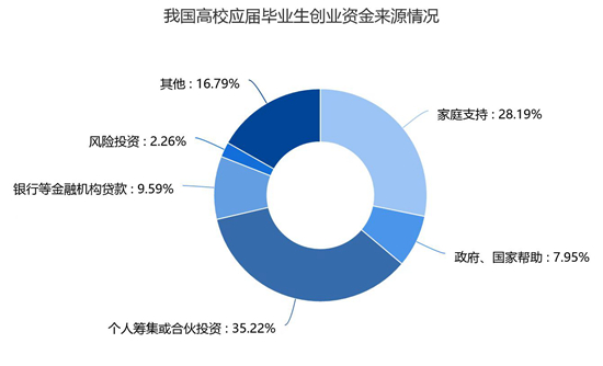 既然资金不足是高校应届毕业生创业困难最高和最需要帮扶的创业需求,那么课题组需要进一步摸清我国高校应届毕业生创业资金来源情况。通过调研课题组发现,应届毕业生创业资金来源由高到低依次为:个人筹集或合伙投资(35.22%)、家庭支持(28.19%)、其他(16.79%)、银行等金融机构贷款(9.59%)、政府和国家帮助(7.95%)、风险投资(2.26%)。可见,应届毕业生创业资金主要依赖于个人与家庭,这极度依赖于个体或家庭的社会资本丰富程度,打破先赋性因素掣肘而有利于毕业生充分创业的社会化支持系统尚未完善。