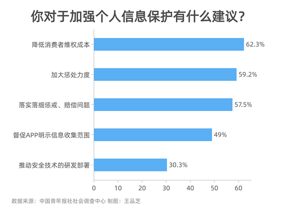 加强个人信息保护,62.3%的受访者建议降低消费者维权成本,提高消费者维权的收益,59.2%的受访者建议加大对泄露个人信息行为的惩处力度,形成有力震慑,57.5%的受访者建议在惩戒手段、赔偿问题上落实落细,49.0%的受访者建议有关部门督促App开发管理者明示个人信息收集范围,30.3%的受访者建议企业要推动数据防窃密、防篡改、防泄露等安全技术的研发和部署。