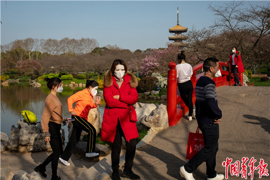 2020年3月14日,湖北省武汉市东湖旁,两名广东医疗队的援鄂护士贴着面膜游园。此时武汉疫情形势有所缓解,部分援汉医护人员进入轮休状态。对于他们来说,半天的休息时间也是宝贵的。中青报·中青网记者 李隽辉/摄