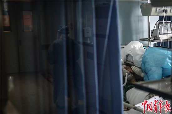 2020年3月5日,武汉金银潭医院ICU病房,一名医护人员尝试与患者沟通。金银潭医院是武汉最大的传染病专科医院,也是武汉第一家收治新冠肺炎确诊患者的定点医院。中青报·中青网记者 赵迪/摄