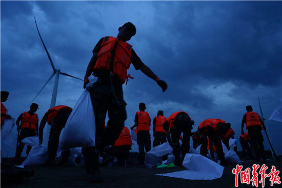 2020年7月11日,江西九江,傍晚的大雨来临之前,武警九江支队官兵在江洲大堤上抢筑子堤,当时该堤段洪水水位已接近堤顶。中青报·中青网见习记者 李强/摄