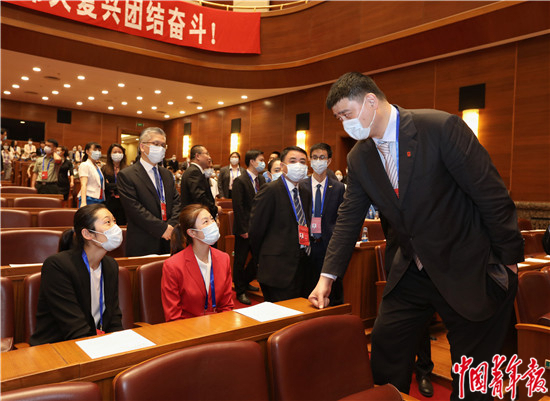 2020年8月17日上午,中华全国青年联合会第十三届委员会全体会议、中华全国学生联合会第二十七次代表大会在京开幕。出席大会的全国青联委员姚明(右)与丁宁(中)、朱婷(左)戴着口罩交流。中青报·中青网记者 李建泉/摄