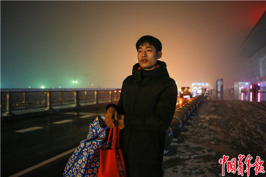 2020年1月16日,安徽阜阳西高铁站,搭乘快递员春运专列从上海回到家乡的18岁快递小哥张宣硕。中青报·中青网记者 曲俊燕/摄