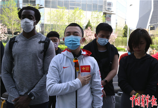 2020年4月4日清明节上午,北京CBD,年轻人默哀,悼念新冠肺炎疫情牺牲烈士和逝世同胞。中青报·中青网记者 陈剑/摄