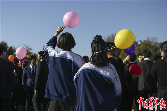 2020年10月22日,北京圆明园遗址公园,北京一零一中学2020届高三年级学生成人礼仪式上,同学们准备放飞气球,庆祝迈入人生的新阶段。中青报·中青网记者 孔斯琪/摄