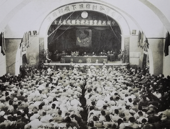杨家岭的南侧山根下,有座气象恢宏的礼堂,叫中央大礼堂。这是七大的主会场。建礼堂时,除了施工人员,中央机关工作人员都来到这里义务劳动,一些人不明白在边区经济比较困难的情况下,为何还要修建这么一个“宏伟”的建筑,还有人给中央秘书长任弼时和副秘书长李富春提意见。他们不知道,这座礼堂是为七大准备的。中央大礼堂1942年竣工落成。这是一座以石头做建材的大礼堂,长35米,宽30米,大跨度拱式结构,厅内没有一根柱子,高大的窗子能够最大限度地采集阳光,所以礼堂外观堂堂正正,里面敞敞亮亮。整个礼堂可容纳上千人。