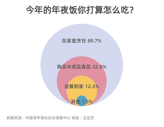 今年的年夜饭,89.7%的受访者在家里烹饪,32.8%的受访者会购买半成品食品烹制,12.3%的受访者会选择送餐到家服务。