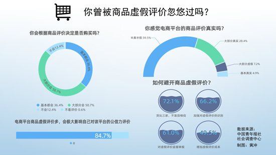 今年3·15前夕,中国青年报社社会调查中心联合问卷网(wenjuan.com),对2036名受访者进行的一项调查显示,87.1%的受访者表示,很多时候会根据商品评价决定要不要购买。但59.5%的受访者感到电商平台的评价半真半假,87.0%的受访者表示曾被虚假评价忽悠过。84.7%的受访者确认,商品虚假评价多,会极大影响对该平台的公信力评价。