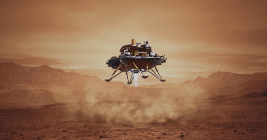 在距离火星地表100米时,天问一号进入悬停阶段,完成精准避障和缓速下降后,着陆巡视器在缓冲机构的保护下,抵达位于火星东经109.9°北纬25.1°的着陆点。
