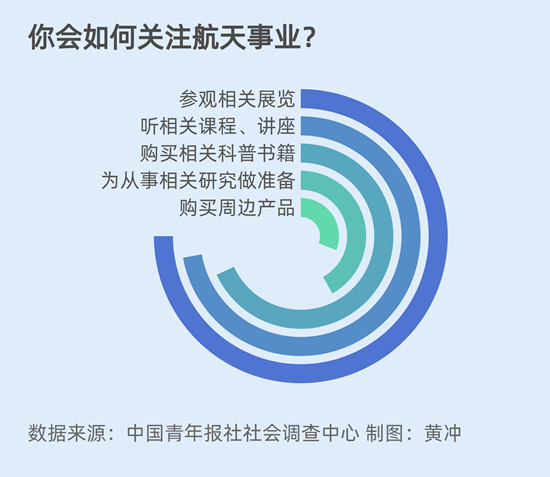 调查中,98.3%的受访青少年都会关注航天事业。具体说来,62.5%的受访青少年会参观相关展览,60.1%的受访青少年会听相关课程、讲座。其他还包括购买相关科普书籍(56.8%)和周边产品(25.8%)等。还有35.0%的受访青少年会为从事相关航天科学研究作准备。