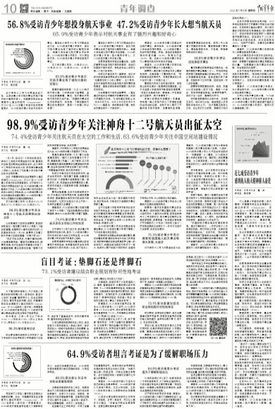 调查中,47.2%的受访青少年表示,长大想当航天员;56.8%的受访青少年想以后投身航天事业。