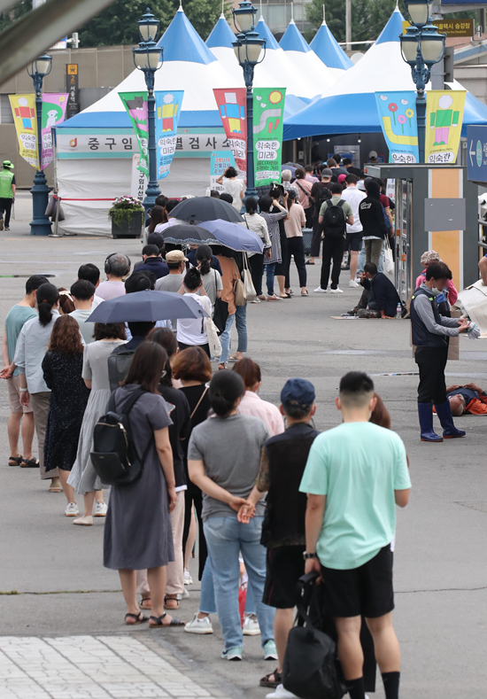 7月7日,韩国首尔市民排队进行新冠病毒检测。韩国7月6日新增新冠确诊病例超过1200例,是去年12月25日后6个月来的最高纪录,也是今年1月4日以后单日新增病例数首次过千例。韩国舆论担心“第四波大流行”在本国已经开始。 视觉中国供图