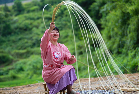 7月9日,杨杜娟在三穗县八弓镇界牌村给竹篾抽丝。