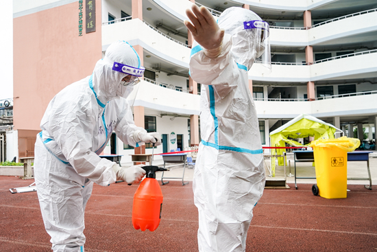 8月9日,在扬州市广陵区汶河街道龙头关社区育才小学采样点,医护人员在进行消杀。