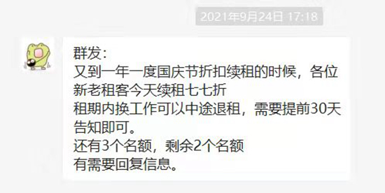 租客们后来才知道,这些专业和热情服务的形象,都是张伟为了吸引人们续租营造出来的。此前,张伟经常推出房租打折活动,吸引租客续租,但前提是必须年付。一位租客说,2020年6月,他和张伟签了一年的租房合同。2020年8月,张伟说续租一年可以打8.5折,他便续租至2022年6月。2021年1月份,张伟说再续一年可以打7.5折,他又续租到2023年6月。
