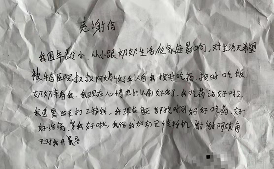 她照顾的一名16岁患者出院时,写了一封感谢信:“我(去工作)给我奶奶买个老年手机,谢谢阿姨对我的开导。”