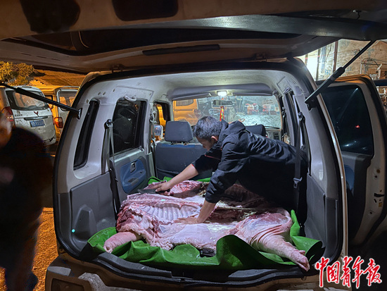 卖猪肉后,他“从行政执法人员变成了被执法对象”。他的“坐骑”变成了一辆“快散架”的二手铃木车。去屠宰场时,后排车座放倒,铺上绿色防水布,两扇生猪肉摊在上面。回家时,先开车窗散味儿,再把后排座复原,人与猪“空间重合”。