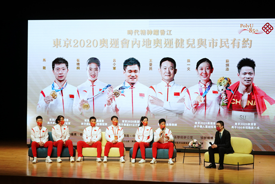 在香港消防及救护学院,纪律部队用直升机、消防车、警车迎接苏炳添、刘诗颖、巩立姣、李发彬、谌利军。苏炳添在警用标志桶摆出的起跑线上展示起跑风采。香港保安局局长郑炳强说,这是奥运健儿与香港纪律部队的首次交流,“我希望纪律部队的同事,青少年制服团体的成员,能够学习奥运健儿的坚毅和努力,为香港、为国家作出更多贡献。”