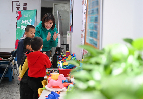 12月4日,张洁(右一)在“村童妈妈聚乐部”教小朋友演唱歌曲《爱的鼓励》。