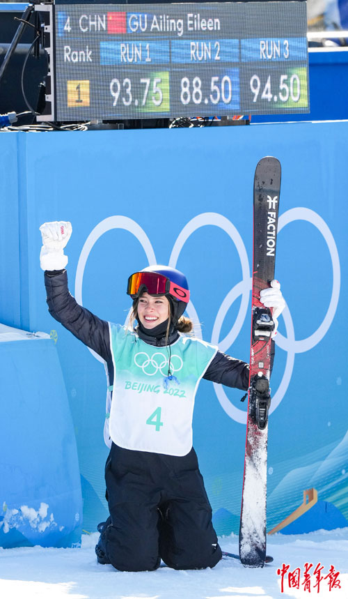 本报北京2月8电(中青报·中青网记者 郭剑)临近中午,阳光洒在首钢大跳台上,中国选手谷爱凌今天凭借“惊天一跃”,逆转赢得本届冬奥会自由式滑雪女子大跳台冠军——“青蛙公主”职业生涯的第一枚冬奥会金牌、中国冬奥会代表团的第三枚金牌,也是这个新奥运项目的首位冬奥会女子冠军。