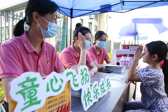 2022年6月28日,安徽省合肥市瑶海区和平小学第二小学的教师正在裕兴家园小区为学区内的一年级新生家长进行报名咨询服务。学校为家长提供线上报名培训,让群众在家门口就能了解招生信息,“一站式”完成新生入学报名工作。 吴海波/摄