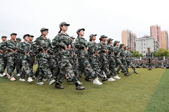 新学期来临,安徽省淮北市的高中组织新生开展军训,锻炼身体素质,磨砺意志品质。万善朝/摄(新华社发)
