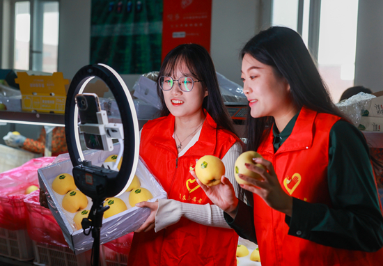 11月10日,在山东省荣成市夏庄镇一处现代果园的仓储中心,党员志愿者通过直播带货帮助果农销售苹果。