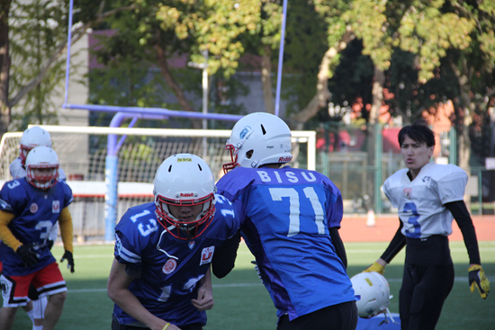 环环相扣是“精细”的体现。美式橄榄球采取分段式进攻。进攻组要利用4次机会来向前推进超过10码的距离(1码≈0.9144米),若中间掉球则轮为被动防守。据初创队长王一奔介绍,在这样的规则下,队员得各司其职,只要有一个人失误,整队都达不到想要的效果,“如果进攻线球员没能拦住对手的冲击,四分位就无法传球;如果四分位传球失误,外接手跑到位置后依旧无法接到球;如果外接手没有跑对路线,或是没有接到球,也会失去进攻机会。”