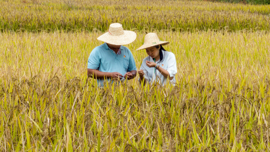 在广西钦州市钦北区贵台镇百美村委那疋村,利远远(右)和村党支部书记梁显茂在查看紫米的饱满度(11月11日摄)。